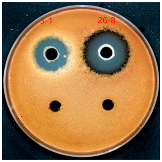 By employing the dilution spread method to isolate soil samples from four regions in Xinjiang, various morphologically distinct single colonies were selected for purification. The strains were initially screened using the plate confrontation method, resulting in the identification of 133 strains exhibiting antibacterial properties. Subsequently, the inhibition zone method was utilized for rescreening, leading to the selection of 110 strains with confirmed antibacterial activity. The antagonistic bacteria were categorized into five groups based on the diameter of the inhibition zones. Specifically, there were 14 strains with inhibition zone diameters ranging from 0 to 5 mm, 10 strains from 5 to 10 mm, 14 strains from 10 to 15 mm, 28 strains from 15 to 20 mm, and 44 strains from 20 to 30 mm (Table 2). Strain 26-8, which demonstrated relatively stable antibacterial activity, was selected, with an inhibition zone diameter of 25.37 ± 0.37 mm (Figure 1).