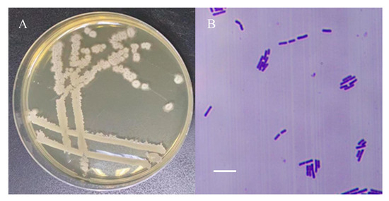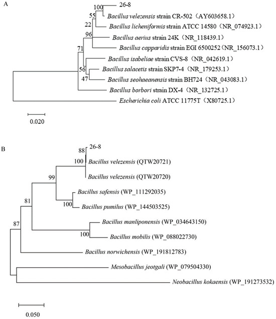 Strain 26-8 forms circular or irregular colonies on nutrient agar (NA) plates, exhibiting a rough, white, opaque surface. The bacteria are rod-shaped and Gram-positive (Figure 2). Physiological and biochemical tests indicated that strain 26-8 yielded positive results in the methyl red test, Voges–Proskauer (V-P) test, catalase test, oxidase test, nitrate reduction test, and hydrogen sulfide (H2S) gas production test. Additionally, strain 26-8 demonstrated the ability to hydrolyze starch, liquefy gelatin, ferment glucose, and utilize citrate, D-mannose, D-mannitol, and D-xylose, but it did not utilize L-arabinose (Table 3). Based on its morphological and physiological characteristics, along with the guidelines from the common bacterial identification manual, strain 26-8 was preliminarily identified as a Bacillus species.
