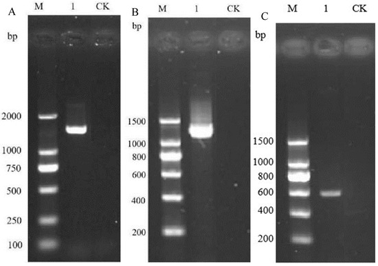 The molecular biological identification methods for antagonistic bacteria are outlined as follows. First, we utilized a DNA extraction kit to isolate the genomic DNA of the antagonistic bacteria. Next, we used the extracted bacterial genomic DNA as a template to amplify target fragments with universal primers for the bacterial 16S rDNA, gyrB, and rpoB genes. The PCR amplification products should be analyzed using 1.7% agarose gel electrophoresis, and the clarity of the electrophoresis bands can be observed with a gel imaging system [19,20]. For bands that exhibited clear amplification products, we sent them to Shanghai Sangon Biotech Co., Ltd. (Shanghai, China) for sequencing. We then employed SeqMan software (version 12.0) to assemble the sequences and subsequently submitted them to the NCBI database for similarity comparison analysis using BLAST software 2.16.0. A phylogenetic tree can be constructed using the Neighbor-Joining method in MEGA7.0 software to determine the classification status of the strains. The amplification system and conditions are detailed in Table 1.