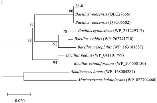 Through the analysis of the 16S rDNA, gyrB, and rpoB gene sequences of strain 26-8, segments of approximately 1500 bp, 1200 bp, and 400–600 bp were amplified, respectively (Figure 3). The sequencing results were submitted to the NCBI database for BLAST comparison analysis, and gene accession numbers were obtained. The Neighbor-Joining method in MEGA 7.0 software was employed to construct a phylogenetic tree (Figure 4). The results indicated that all three gene sequences clustered together with Bacillus velezensis, exhibiting similarities of 99.28%, 99.64%, and 100%, respectively. In conjunction with morphological and physiological biochemical characteristics, strain 26-8 was identified as Bacillus velezensis.