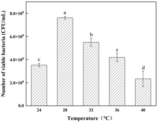 Effect of temperature on the growth of strain 26-8. Different lowercase letters represent significant differences between treatments (p < 0.05). Data marked with the same letter on the columns indicate no significant difference (p ≥ 0.05) according to Duncan’s multiple comparison tests.