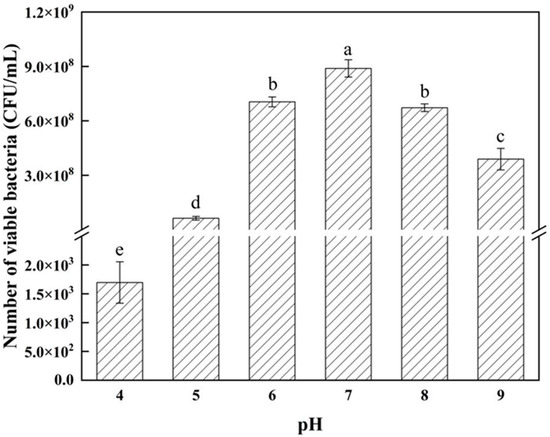 Effect of pH on the growth of strain 26-8. Different lowercase letters represent significant differences between treatments (p < 0.05). Data marked with the same letter on the columns indicate no significant difference (p ≥ 0.05) according to Duncan’s multiple comparison tests.