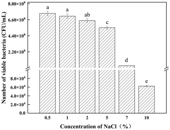 Effect of NaCl concentration on the growth of strain 26-8. Different lowercase letters represent significant differences between treatments (p < 0.05). Data marked with the same letter on the columns indicate no significant difference (p ≥ 0.05) according to Duncan’s multiple comparison tests.