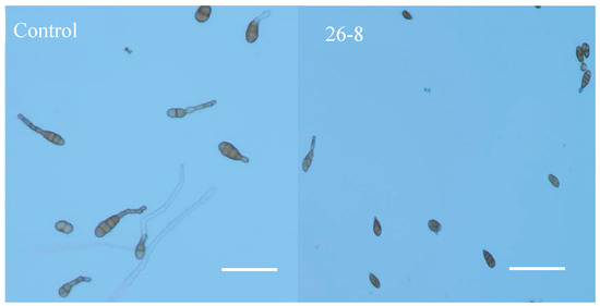 Microscopy of strain26-8 inhibition of conidium germination of Alternaria alternata. (under 10 × 40 times optical microscope). Scale bars: control, 26-8 = 10 μm.