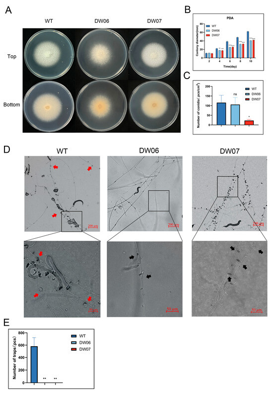 Colony morphology, growth rate, conidia production, and trap formation ability of wild-type (WT) strain and UV-induced mutants (DW06 and DW07). (A) Top and bottom views of colonies of WT, DW06, and DW07 on the PDA medium. (B) Colony diameter of WT and mutants on the PDA medium. Data represent mean ± standard deviation (SD) (n = 4). (C) Spore production per square centimeter of colonies of WT and mutants after 10 days on CMA medium. Data represent mean ± standard deviation (SD) (n = 3). (D) Traps formed by WT, DW06, and DW07 strains after co-cultivation with nematodes for 24 h. The red arrow points to the normal constricting ring trap, and the black arrow points to the abnormal constricting ring trap. (E) Number of normal constricting rings induced by nematodes. Data represent mean ± standard deviation (SD) (n = 3). In (B), two-way ANOVA analysis was conducted. In (C,E), t-test analysis was performed. *, p ≤ 0.05; **, p ≤ 0.01; ***, p ≤ 0.001; ****, p ≤ 0.0001; ns, p > 0.05.