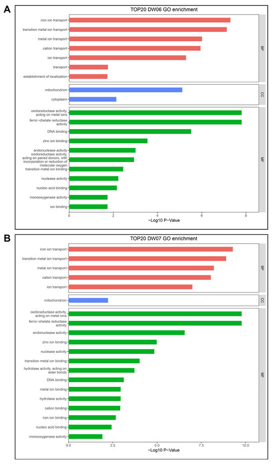 DW06 and DW07 were aligned with the wild-type gene sequences to conduct enrichment analysis of mutation sites using Gene Ontologies (GO) (Figure 2, Tables S7 and S8). The results indicated that genes related to molecular functions and biological processes were highly enriched. A large number of mutation sites were enriched in oxidoreductase activity, acting on metal ions (GO:0016722), DNA binding (GO:0003677), cation transport (GO:0006812), and iron ion transport (GO:0006826). In addition, chitinase activity (GO:0004568), oxidoreductase activity (GO:0016491), catalytic activity (GO:0003824), and integral component of membrane (GO:0016021) were enriched (Tables S7 and S8). This suggests that mutated genes are mostly associated with cellular structure, cellular metabolism, and signal transduction.