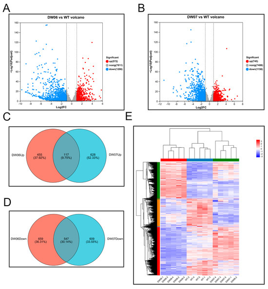 Overview of differentially expressed genes (DEGs) between two UV-induced mutants and wild-type. (A,B) Volcano plots of DEGs (P.adj < 0.05, |log2FC| ≥ 1) between DW06 vs. WT and DW07 vs. WT. (C,D) Venn diagrams of upregulated DEGs (C) and downregulated DEGs (D) in the two gene sets. The orange and blue circles represent the two genomes (DW06 vs. WT, DW07 vs. WT), respectively. (E) Heatmap of clustering analysis. Each column represents a sample, and each row represents a gene. The normalized gene expression values are represented in different colors.