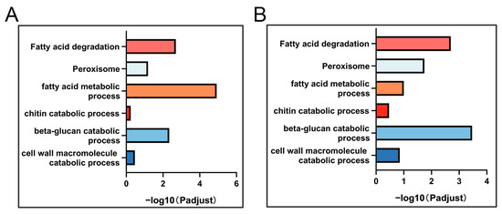 GO and KEGG enrichment analyses were conducted on genes from the DW06 vs. WT and DW07 vs. WT gene sets. According to the analysis of GO and KEGG enrichment results, a large number of genes related to carbohydrate metabolism, lipid metabolism, and amino acid metabolism were enriched, which may lead to a significant decrease in the growth rate of the two UV-induced mutants compared with the wild-type (Figures S6 and S7, Tables S12–S15). Additionally, gene terms and pathways related to trap formation were also enriched (Figure 4). The contraction rings of D. dactyloides are formed by specialized hyphae, and during the process of contraction ring formation and maturation, several layers of cell wall are formed on the inner wall of the ring, which involves cell wall remodeling [8]. Enrichment of the GO term “cell wall macromolecule catabolic process (GO:0016998)” was found in both the DW06 vs. WT and the DW07 vs. WT DEG sets. The genes (Dda_0210/Dda_3377/Dda_5701/Dda_3282/Dda_7889) in this GO term were downregulated in DW06 and DW07 compared to the wild-type strain. Additionally, enrichment of the GO term beta-glucan catabolic process (GO:0051275) was observed, and the genes (Dda_8810 and Dda_0739) in this GO term were homologous to glucanase genes, showing downregulation compared to WT expression levels. The GO term chitin catabolic process (GO:0006032) was also enriched in the DEGs in both the DW06 vs. WT and the DW07 vs. WT comparisons (Dda_7450 and Dda_0366).