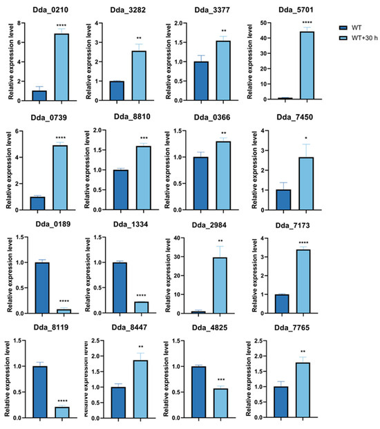 qPCR validation of genes involved in trap formation in D. dactyloides. Total RNA was extracted from the wild-type (WT) plants without nematode induction and the wild-type plants induced with nematodes for 30 h (WT + 30 h). Genes enriched in GO enrichment and KEGG enrichment were selected for qPCR validation. Analysis was performed using t-test. * p < 0.05; ** p < 0.01; *** p < 0.001; **** p < 0.0001.