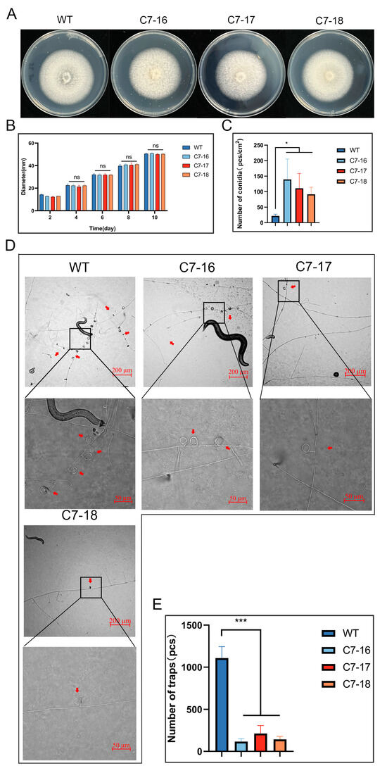 Previous studies have demonstrated that the MAPK pathway is involved in the formation of traps. Here, the STE2 homologous gene DdSTE2, a member of the MAPK pathway, was selected for knockout analyses. This gene was chosen because it showed different patterns between the transcriptome analysis and the qPCR analysis. Three strains of ∆DdSTE2 mutants, C7–16, C7–17, and C7–18, were obtained by homologous recombination through PCR (Figure S8). There was no significant difference in colony morphology and growth rate between WT and ∆DdSTE2 mutants on PDA and CMA media (Figure 6A,B and Figure S9A,B). However, the DdSTE2 knockout mutants showed a significantly higher number of conidia than WT on CMA (Figure 6C). There was no significant difference in the germination ability of conidia between WT and ∆DdSTE2 mutants (Figure S9C).