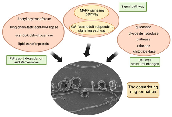To investigate the molecular mechanisms underlying the formation of constricting rings, it is necessary to study the process at the genetic level. Proteins such as Crz1 and STE12 are important in the Ca2+/calcineurin-dependent signaling pathway and the MAPK pathway. Knocking out the genes encoding DdaCrz1 and DdaSTE12 in D. dactyloides led to a reduction in the formation of constricting rings, demonstrating that the Ca2+/calmodulin-dependent signaling pathway and MAPK pathway are involved in the ring formation in D. dactyloides [10,11]. t-SNARE and v-SNARE are involved in the fusion of intracellular and extracellular vesicles and cell membranes. Knocking out the genes encoding v-SNARE proteins DdSnc1 and DdVam7 revealed that constricting ring cells cannot form large vesicles. It was also determined that the fusion of small vesicles to form large vesicles and the formation of Palisade-shaped Membrane-building Structures (PMS) within the ring cells are critical for constricting ring inflation [12,13].