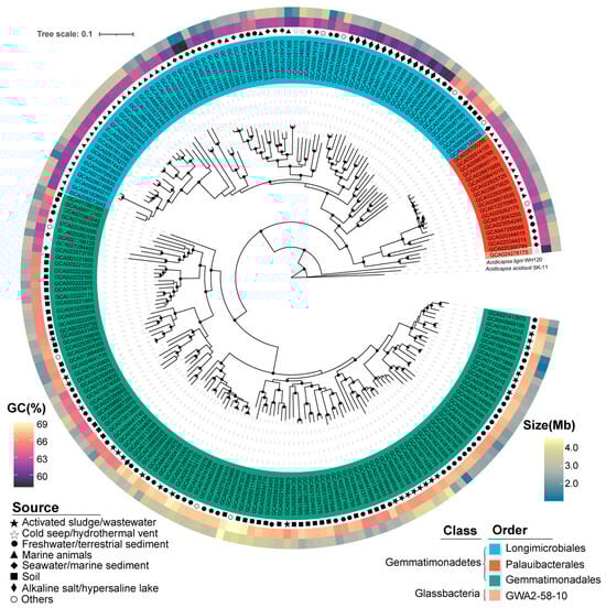 A total of 1356 genomes of Gemmatimonadota available in the NCBI database were downloaded. After quality control (check M), dereplication (dRep [], 95% ANI), and taxonomic confirmation (GTDB-TK []), 213 high-quality and non-redundant Gemmatimonadota genomes were retained (Table S1). These genomes were all with ≥95% completeness and ≤5% contamination (Table S1), and were retrieved from various habitats worldwide, including freshwater/terrestrial sediments (25.8%), marine animals (18.7%), soil (18.3%), activated sludge/sewage (11.7%), seawater/marine sediments (8.9%), alkaline salt/hypersaline lake (7.9%), cold seeps/hydrothermal vents (1.4%) and other environments (4.2%, including biofilm, fossil, wood decay, bark surface of an Acer pictum subsp, rock and aquaculture biofloc) (Figure S1). Genome sizes range from 1.82 to 7.48 Mb, with a median of 3.71 Mb, and their GC content ranges from 57.90% to 69.10%, with a median of 64.90% (Table S1). The variations in genome sizes and GC contents indicate high diversity within the phylum Gemmatimonadota.