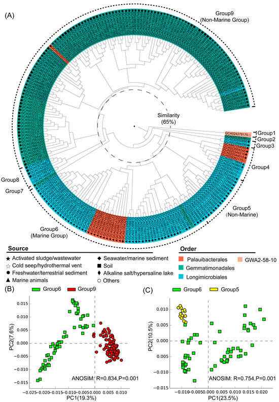 (A) Hierarchical clustering of Gemmatimonadota genomes based on Bray–Curtis similarities between annotated gene profiles (gene list and their copy numbers detailed in Table S2). The inner middle and outer circles around the dendrogram represent order-level taxonomies and their environmental sources, and the grouping of the Gemmatimonadota genomes, respectively. (B) PCA analysis for the marine (group 6) and non-marine groups (group 9) with statistical tests (ANOSIM). (C) PCA analysis for the marine (group 6) and non-marine groups (group 5) with statistical tests (ANOSIM).