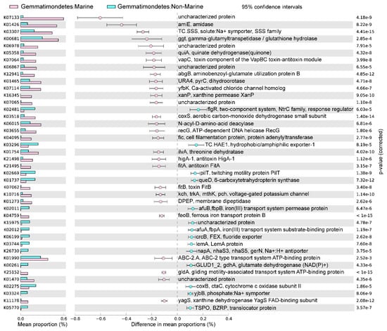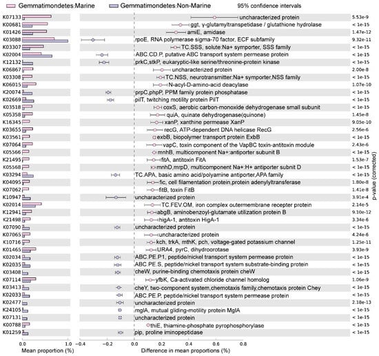 The gene profiles of different groups were further compared and visualized with the Statistical Analysis of Meta-genomic Profiles (STAMP) v2.1.3 software package [], and the genes with significant differences (p-value < 0.05, effect size > 0.1) between the compared groups were further identified using Welch’s t-test.
