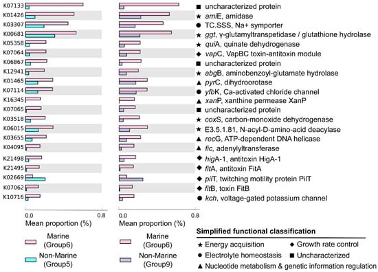 Genes significantly enriched in marine (group 6) or non-marine groups (group 5 and group 9). Only the KOs that were consistently identified in both the comparisons of group 6 vs. 5 and group 6 vs. 9 were shown. Factors were ranked by effect size in descending order and only those with an effect size greater than 0.1 were selected. Mean proportion means the average proportion of each corresponding gene in each genome. The gene names, their encoded enzymes, and the functions of enzymes are labeled at the right-hand side of the figure. The functional classifications of the genes were indicated with different symbols.