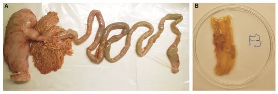 In January 2021, freshly collected intestinal tracts of Northeast Arctic cod were obtained from a fish factory outside of Tromsø, Norway (latitude 69.851620, longitude 18.821799). Intact gastrointestinal tracts (stomach-pyloric caeca-intestine-rectum-anus) were collected from the end of a processing line in the fish slaughterhouse during the processing of freshly landed catches of adult NEAC cod. The sex of the animals from which the organs originated is therefore not known. Figure 1A shows the intestinal tract of one specimen. The intestinal tracts were emptied of their lumen content (feces and transient bacteria) by gently squeezing the intestines before washing them with sterile saline solution three times. The intestines were then cut with a clean scissor and placed on a sterile dish. Using disposable plastic pipettes and spoons, any remaining feces were removed from the inside of ca. 10 cm section of the intestine segments (Figure 1B), and the mucus was collected in 2 mL Eppendorf tubes by scraping the inside surface of the intestines. The mucus samples were stored at −80 °C for up to six months before DNA extraction.