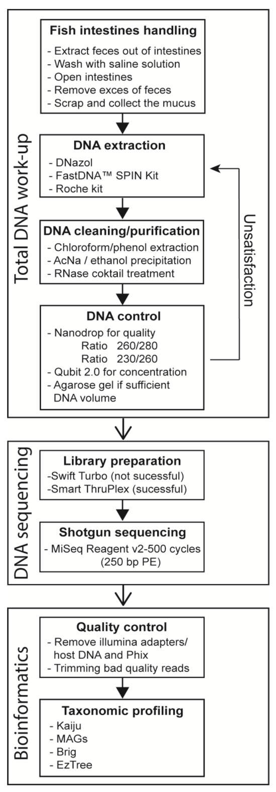 Schematic representation of the workflow from the handling of fish intestines to analyzing the sequencing data using bioinformatics.