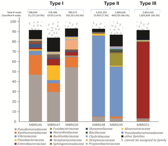 Bar chart showing the taxonomic profile of the adherent microbiota of the gastrointestinal tract of the Northeast Arctic cod. The most abundant families from six mucosal samples, i.e., MBRG-46 to MBRG-51 are shown. Data is based on shotgun DNA sequencing using an Illumina Miseq instrument and the V2 chemistry (250 bp end-pair reads). Taxonomic profiles were grouped into three “types”, i.e., Type I–Type III, based on their most abundant families.