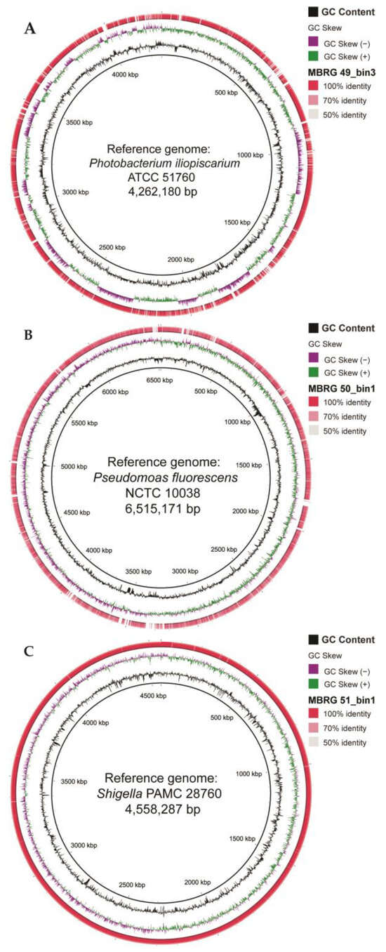 The remaining three mucosal samples only produced low-quality bins (due to limited read lengths and low number of classified reads) and were discarded (see Materials and Methods for more details). Additionally, we analyzed the five high-completeness MAGs/bins from samples MBRG 49 (Bins 1–3), MBRG 50 (Bin 1), and MBRG 51 (Bin 1) using Sendsketch from BBMap package []. Three high-completeness bins from sample MBRG-49 were all identified as Photobacterium iliopiscarium, a bin from sample MBRG-50 was identified as Pseudomonas fluorescens, and a bin from sample MBRG-51 was identified as Shigella sp./Escherichia coli, respectively. This result agrees with the most abundant families identified by Kaiju (see Figure 3), but further narrows the bacteria to genus or species level. The size of one bin per sample corresponds well with the expected sizes of reference genomes, i.e., 4.17 Mb (Bin 3 from sample MBRG-49) versus 4.26 Mb (P. iliopiscarium ATCC 51760), 7.7 Mb (Bin 1 from sample MBRG-50) versus 6.5 Mb (P. fluorescens), and 4.53 Mb (Bin 1 from sample MBRG 51) versus 4.55 Mb (Shigella PAMC 28760). Furthermore, BRIG analysis showed that the three MAGs were matching their respective references (Figure 4).