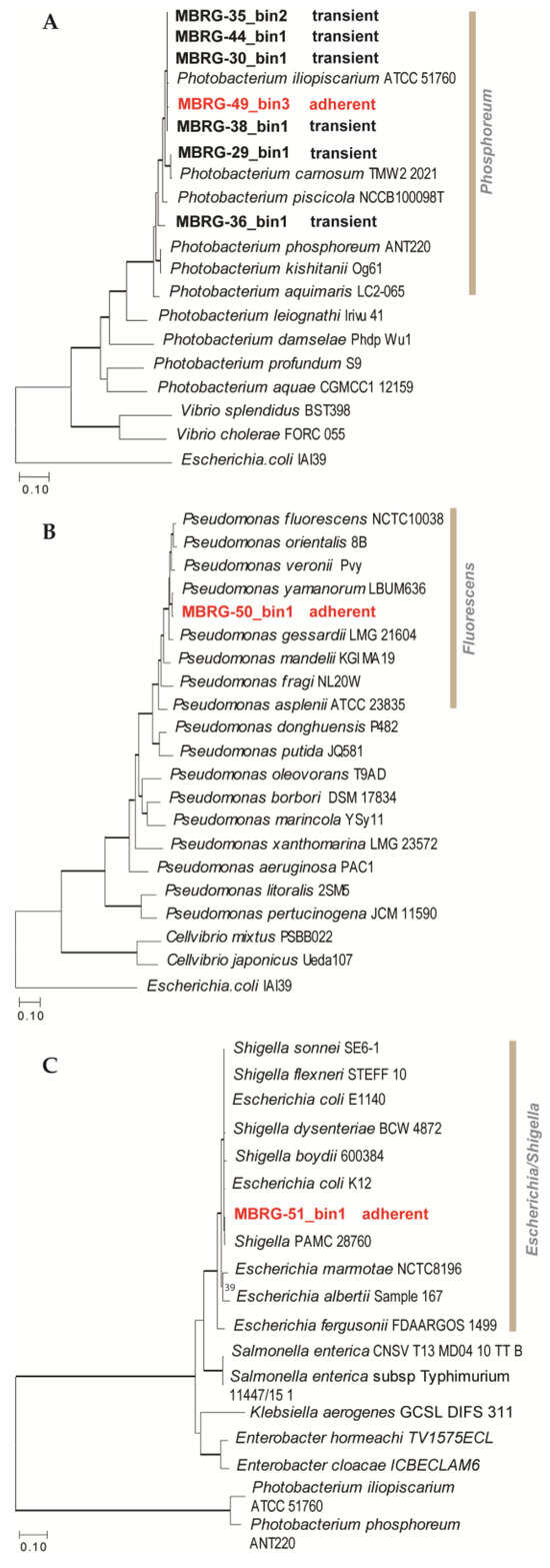 The final protein datasets produced by EzTree consisted of 96, 282, and 81 concatenated marker genes, respectively. Figure 5 shows that MBRG-49_bin3 (Type II taxonomic profile) is found nested within the Photobacterium phosphoreum clade and is closely related to P. iliopiscarium. The placement of MBRG-49_bin3 (from the adherent microbiota) is identical to that of MAGs identified as part of the transient gut microbiota (see e.g., MBRG-38_bin1 and MBRG-30_bin1 in Figure 5). MBRG-50_bin1 (Type I taxonomic profile) is placed within the Pseudomonas fluorescens group and branches as a sister to P. yamanorum (a bacterium found in Antarctica) (Figure 5B). Finally, MBRG-51_bin1 (Type III taxonomic profile) is positioned within Escherichia/Shigella, and is most closely related to Shigella PAMC 28760 (Figure 5C).