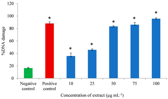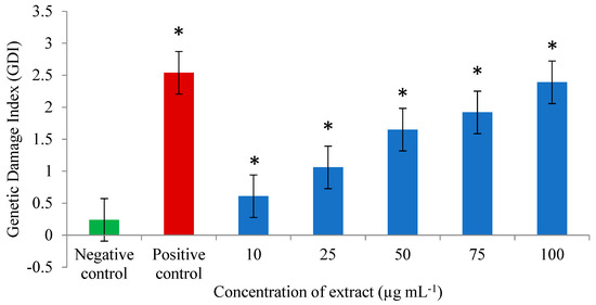 Statistical analysis was performed using the SPSS (version 20) software package and the results were expressed as mean ± standard deviation (SD). A one-way analysis of variance (ANOVA), with Tukey’s post hoc test, was used for the comparisons of the treatments with the negative control. The relationship between the tested extract concentrations and both % DNA damage and GDI values was determined using the Pearson correlation coefficient. Differences with p < 0.05 and p < 0.0005 were considered statistically significant.
