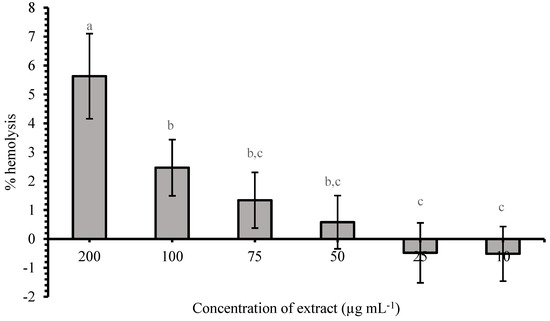 Percentage of hemolysis induced by different concentrations of cyanobacteria biomass methanolic extract. Results are presented as a mean of the tree replication of the experiment performed separately on erythrocytes obtained from 3 healthy human donors ± standard deviation (SD). Values with different letters are significantly different (p < 0.05), as determined using Tukey’s post hoc test.