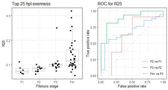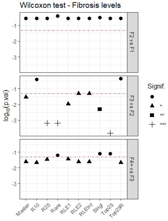 Statistical significance was contrasted with the non-parametric Mann–Whitney–Wilcoxon (MWW) test [], comparing the value of each of these indices between liver stages F2 and F1, F3 and F2, and F4+ and F3.