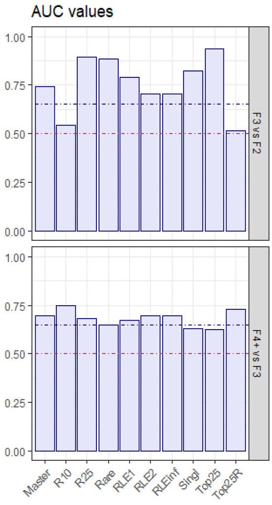 Table 2 shows the metrics for the tests Stage2 vs. Stage1, resulting in adjusted p-values below 0.05 and AUC values above 0.65. Values of the tests for F2 and F1 are excluded as inconclusive. Benjamini–Hochberg-adjusted p-values of these tests are represented in logarithmic scale in Figure 1.