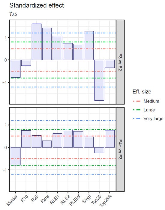 The effect size of quasispecies maturity indices [,], in the comparison of liver damage stages, was quantified by three metrics: area under the ROC curve (AUC), rank–biserial correlation (R_RB), and a robust non-parametric metric version of Cohen’s d (γ0.5) (Table 2, Table 3 and Table 4, and Figure 2 and Figure 3).