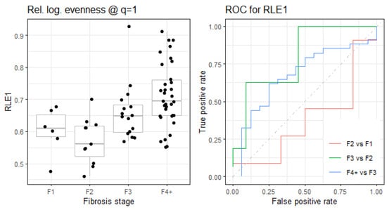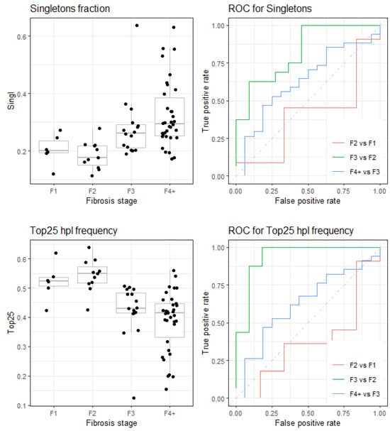 As observed in the next boxplots and ROC curves of selected indices (Figure 4 and Figure 5), the comparison of F2 and F1 showed an inverted effect with respect to the comparisons F3 vs. F2 and F4+ vs. F3, which showed the expected evolution towards higher diversity and maturity in the quasispecies as liver damage progressed. The variable connecting quasispecies diversity increase and liver damage progression is infection time. It is unclear why the evolution from F1 to F2 that we observe in the quasispecies was towards limiting diversity. Our dataset included only two patients (six amplicons) with F1, which did not allow us to extract any conclusion about evolution from F1 to F2. A larger patient cohort would have helped clarify whether the observed patterns were biological or a result of random variation due to sample size.