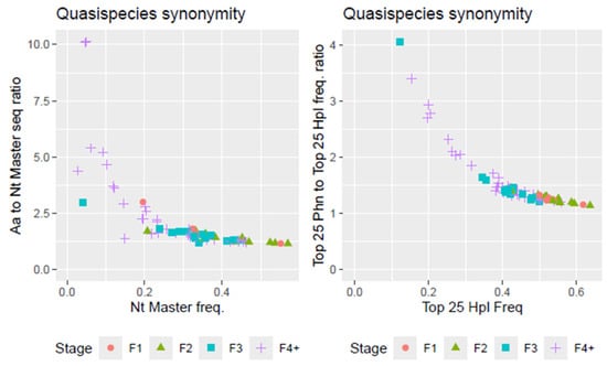 In addition to characterizing quasispecies maturity through indicators based on haplotype distribution, quasispecies synonymity offers further insights into the maturation process. Synonymity emphasizes the relationship between haplotype diversity and expressed phenotypes. This feature can be quantified by calculating the frequency ratio of the master phenotype to the master haplotype and, more broadly, by comparing the frequencies of the top N phenotypes to the top N haplotypes [,].