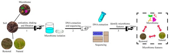 Microbiome feature identification in natural and ecologically restored soils. Workflow for the separation, DNA extraction, and sequencing of soil microbiomes.