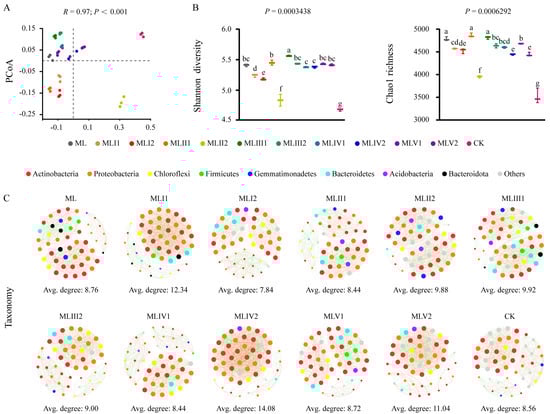 To gain deeper insights into the effects of various ecological restoration methods on soil microbiomes, we evaluated the α diversity and co-occurrence patterns of the microbial communities. The results demonstrated that ecological restoration exerted a profound influence on microbial diversity, as evidenced by significant increases in both Shannon diversity and Chao1 richness than the control group did (Figure 2B). MLIII1 exhibited the highest Shannon diversity index, followed by MLII1, whereas MLII1 exhibited the highest Chao1 richness, followed by MLIII1 (Figure 2B). An LMM analysis of all samples further confirmed this trend, with t-values for Shannon diversity and Chao1 richness in the MLII1 group being 28.0 and 28.3, respectively, and in the MLIII1 group being 32.1 and 27.3, respectively, all higher than those in the other treatment groups. These findings strongly supported previous results (Table S3). However, from the perspective of species network complexity, these two restoration groups were not the highest (the average degrees for MLII1 and MLIII1 were 8.44 and 9.92, respectively) (Figure 2C; Table S4). This indicates that although ecological restoration may alter the structure of microbial communities, it does not necessarily alter the interaction patterns among microorganisms.