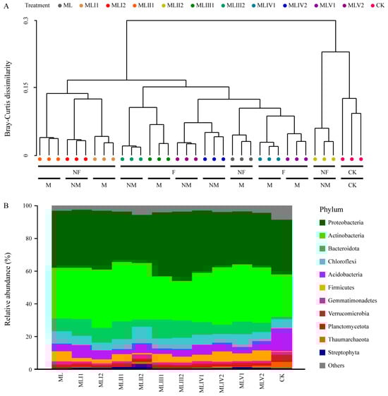 The microbial community structure and taxonomic composition varied among the different treatments. (A) Hierarchical clustering based on Bray–Curtis distances of the microbial phylum. NF, F, NM, and M represent no fertilization, fertilization, no microbial agent, and microbial agent, respectively. (B) Taxonomic composition of microbial communities in different treatments. Low-abundance phyla with less than 1% of the total sequence across all samples are grouped into “Others”.