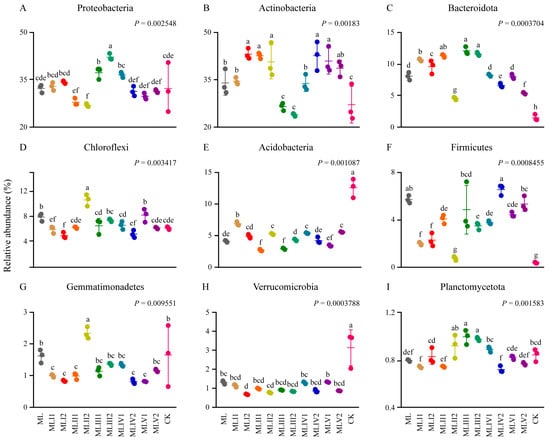 The relative abundances of the dominant phyla varied among the different treatments. (A–I) Relative abundance of dominant phyla in the different treatments. Different lowercase letters above the dots indicate significant differences (p < 0.05).