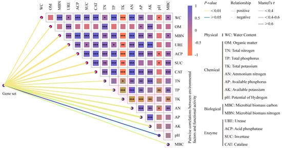 The potential drivers and ecological functions of microbial communities in the soil determined by Mantel tests were based on Spearman’s correlations. Correlations among microbial communities, soil physicochemical and biotic characteristics, and soil enzyme activity are shown. The edge width corresponds to the Mantel’s r statistic for the corresponding distance correlations (based on Bray–Curtis distance matrices of the microbial community and Euclidean distance matrices of environmental factor data), and the edge color denotes the statistical significance based on 999 permutations. Asterisks indicate the strength of Spearman’s rank correlation, with a greater number of asterisks indicating a higher correlation strength. The factors denoted in blue and orange suggest a substantial correlation between environmental factors and the microbial community.