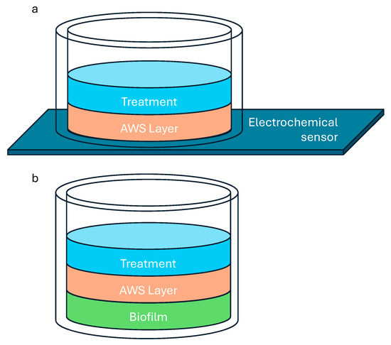 A schematic of the experimental design for (a) the electrochemical sensor and (b) the AWS–biofilm model.
