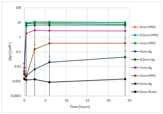 The silver penetration given as an average Ag+ concentration (mM) at the sensor surface for MMC and AgNO3 solutions. The errors represent the standard deviation of the mean.