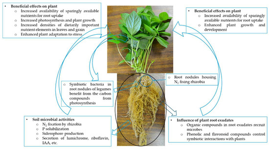 The term rhizosphere is used to describe the zone of soil that surrounds plant roots. It is usually characterized by a high diversity of bacterial genera and species [32,33] that promote plant growth and adaptation [34]. The synthesis and release of various metabolites by rhizobacteria [27] and their role in the improvement of plant performance has been reviewed by earlier reports [35]. These rhizobacteria comprise species that either enter into intricate symbiotic associations with plants or that exert indirect plant growth promotion via the rhizodeposition of metabolites to enhance the availability of important nutrient elements for plant uptake [36]. Symbiotic rhizobia are, for example, characterized by their ability to colonize root hairs of legumes and induce the formation of nodules which are factories where N2 is reduced to NH3 by bacteroids and exchanged for plant photosynthate [37]. Rhizobia are therefore the most important soil bacteria in agriculture due to their significant N contribution to cropping systems and natural ecosystems when in association with members of the Leguminosae [38,39].