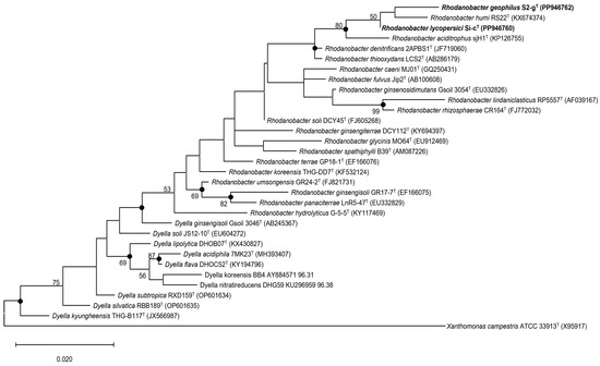 For phylogenetic analysis, this study sequenced the 16S rRNA genes of Si-cT and S2-gT using the Sanger method and retrieved the full-length 16S rRNA sequences from the genomes of these strains. The genome-derived 16S rRNA sequences were used for all phylogenetic analyses. The 16S rRNA genes of strains Si-cT and S2-gT were amplified using universal primer set 27F (5′-AGA GTT TGA TCC TGG CTC AG-3′)/1492R (5′-GGT TAC CTT GTT ACG ACT T-3′) [34] and 518F (5′-CCA GCA GCC GCG GTA ATA C-3′)/805R (5′-GAC TAC CAG GGT ATC TAA TC-78 3′) [35] and sequenced by Sanger method at Solgent Co., Ltd. (Daejeon, Republic of Korea). PCR was performed on an ABI PRISM 3730XL DNA Analyzer (Applied Biosystems, Waltham, MA, USA) with 30 cycles of denaturation at 96 °C for 10 s, annealing at 50 °C for 5 s, and extension at 60 °C for 4 min. The reaction mixture contained 4 µL of Terminator Ready Reaction Mix, 1 µL of cleaned PCR product (20–40 ng), 1 µL each of forward and reverse primers (5 pmol), and sterile water to a final volume of 10 µL. The amplicons were compiled using SeqMan software version 5.0 (DNASTAR, Madison, WI, USA). Nearly full-length 16S rRNA gene sequences of the two strains were obtained using the Sanger method, and full-length 16S rRNA gene sequences were retrieved from the draft genomes using ContEst16S [36]. The sequences from both methods were compared using the NCBI nucleotide BLAST server [37]. The 16S rRNA gene sequences obtained from the genome were uploaded to the EzBioCloud server (www.ezbiocloud.net/, accessed on 10 September 2024) [38] to identify phylogenetic neighbors based on 16S rRNA gene sequences of type species with valid names. Phylogenetic analysis was performed using phylogenetic trees constructed with MEGA version X software [39] by employing the maximum likelihood (ML), neighbor-joining (NJ), and maximum parsimony (MP) algorithms [40,41,42]. The confidence level of tree topologies was determined through bootstrap analysis with 1000 replicates [43]. Xanthomonas campestris ATCC 33913T was used as an outgroup. The GenBank accession numbers for the 16S rRNA gene sequences of strain Si-cT are PP647361 (Sanger method) and PP946760 (whole genome). For strain S2-gT, the accession numbers are PP647365 (Sanger method) and PP946762 (whole genome).