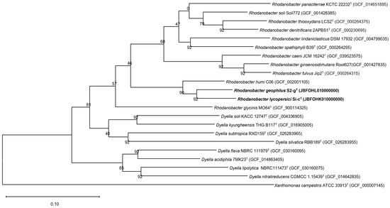For screening bacterial colonies, the soil samples were prepared using previously described methods [17,18]. The tomato plant was uprooted from the pot, and the soil on the roots was vigorously shaken off and washed with running tap water to remove any non-adhering soil. A total of 2 g of soil surrounding the roots was transferred into a 50 mL conical tube along with 5 mL of sterilized 0.85% (w/v) NaCl. Subsequently, the rotated mixture was diluted to 10−1–10−4 using the same reagent, and 100 μL of each dilution was spread on Reasoner’s 2A (R2A; MB Cell, Seoul, Republic of Korea) agar that was incubated at 30 °C for 3 days. Strains Si-cT and S2-gT were repeatedly re-streaked on the same medium to ensure purity. Pure colonies of each strain were stored at −80 °C in a 25% (v/v) glycerol mixture, prepared by combining R2A broth and 50% glycerol in a 1:1 ratio for long-term preservation. Strains Si-cT and S2-gT have been deposited in culture collections under the accession numbers KACC 23732T and TBRC 19125T for Si-cT and KACC 23733T and TBRC 19012T for S2-gT.