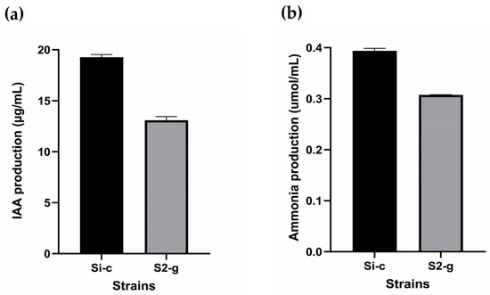 According to Salkowski’s test, strain Si-cT produced 19.3 µg/mL of IAA, which was greater than the 13.1 µg/mL produced by strain S2-gT (Figure 3a). These levels were comparable with the IAA production of the PGPB strain Pseudomonas azotoformans NBRC 12693T [64]. In the ammonia production assay, Si-cT produced 0.39 µmol/mL, while S2-gT produced 0.31 µmol/mL (Figure 3b), values comparable to those of the PGPB strain Enterobacter hormaechei J146 [65].