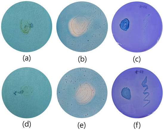Results of the plant growth-promoting traits, including nitrogen fixation, siderophore production, and phosphate solubilization. Strains Si-cT and S2-gT are shown in (a–f), respectively. (a,d) represent nitrogen fixation; (b,e) represent siderophore production; (c,f) represent phosphate solubilization.