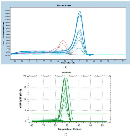 During the first stage of the reaction, HOT FIREPol® DNA polymerase was activated by a 12 min incubation at 95 °C. This prevents the amplification of sequences with non-specifically attached primers and the formation and subsequent amplification of primers–dimers at lower temperatures during the assay. The specificity of the final amplification products was assessed based on the fluorescence intensities of the obtained melting curves and their automatic logarithmized calculations and visualizations. Table 3 shows the melting temperature (Tm) peak values of the determined genes. The visual examples of the results of the specificity evaluation for both thermal cyclers used are shown in Figure 1. Amplification peaks falling within the temperature range of the reference strain genes were classified as positive, while those showing different shapes and melting temperature peaks were considered non-specific products. Their appearance was equivalent to the lack of an appropriate complementary amplification product. Therefore, such results were classified as negative.