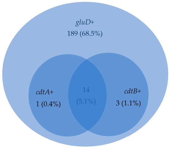 Diagram showing the frequency of co-occurrence of the gluD, cdtA and cdtB genes (n = 276), where cdtA+—the presence of binary toxin subunit A gene; cdtB+—the presence of binary toxin subunit B gene; gluD—the glutamate dehydrogenase gene; n—the number of samples with detected gluD and cdtA and/or cdtB gene.