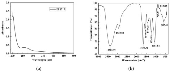 UV–Vis spectroscopy was used to identify the existence of nucleic acids (NAs) and proteins in the EPS. The UV–Visible spectrum of EPS is depicted in Figure 1a. The λmax wavelength of EPS715 was around 200 nm, which is the typical absorption peak of polysaccharides [24]. The absence of absorption peaks (260 and 280 nm) indicates no NAs and protein in EPS715 [34].