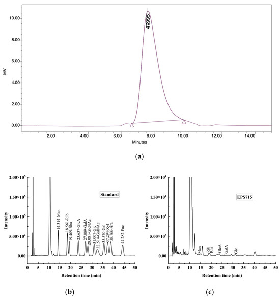 The Mw and monosaccharide composition of EPS715. (a) GPC chromatogram of EPS715. The peak width was marked in the spectragram. (b) HPLC spectrum of the standard. (c) HPLC spectrum of the EPS hydrolates.