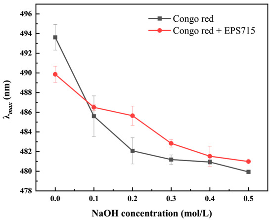 The Congo red experiment is usually performed to identify the triple-helix structure of EPSs. The same procedure was followed as outlined by Guo et al. [25] with slight changes. Briefly, Congo red (1 mg/mL) was mixed with EPS (1 mg/mL) solutions in an equal volume. The NaOH solution (1 mol/L) was added to produce a series of solutions with different NaOH (0.1 to 0.5 mol/L) concentrations and kept at RT in the dark for 5 min. The maximum absorption wavelength (λmax) of the mixture was scanned at 400 to 700 nm. Congo red and water without EPS were used as the control. Next, we plotted the λmax versus NaOH concentration.