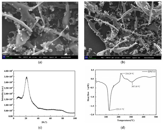 Microstructural and thermal characteristic analysis of EPS715. (a) SEM image of EPS715 at 1000×. (b) SEM image of EPS715 at 2000×. (c) XRD pattern. (d) DSC of EPS715.