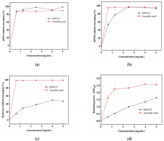 Figure 5 demonstrates the ability of EPS715 to scavenge various free radicals. In general, EPS715 exhibited remarkable antioxidant properties. The scavenging rates of EPS715 toward ABTS ranged from 87.48 ± 7.63% to 98.64 ± 2.70%, and a concentration of 5 mg/mL of EPS715 exhibited the highest scavenge ability (Figure 5a). EPS715 also exhibited a commendable scavenging efficacy against DPPH and hydroxyl radicals. The investigation showed that EPS715 at a concentration of 2.5 mg/mL exhibited the most significant DPPH scavenging effect, with a 97.37 ± 0.79% scavenging rate (Figure 5b). EPS715 exhibited a lower efficacy in scavenging hydroxyl radicals compared to DPPH and ABTS. However, the IC50 of EPS715 was 4 and 5 mg/mL (Figure 5c). As depicted in Figure 5d, EPS715 also displayed notable reducing activity and concentration dependence. The reducing capacity of EPS715 at 5 mg/mL was observed to be 1.64 ± 0.05 absorbance at 700 nm. With respect to the ascorbic acid standards, EPS715 was equivalent to 0.629 mg/mL of ascorbic acid. The antioxidant activity of the EPS is significantly affected by its monosaccharide composition, proportion, functional groups, and net charge [53,54]. The results show that EPS715 had good antioxidant activity and can be used as a potential antioxidant of natural origin, which provides a theoretical basis for future application in the field of food and pharmaceutical engineering.